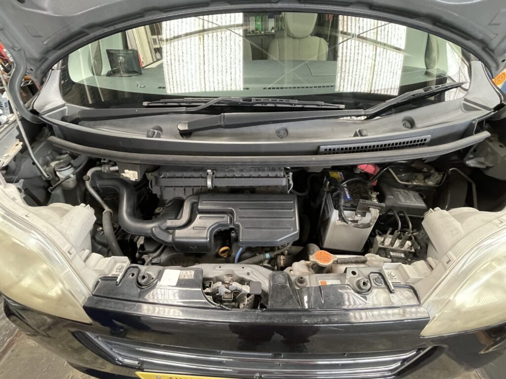 フロントバンパーを取り外し、古いエアコンガスの回収を行います。